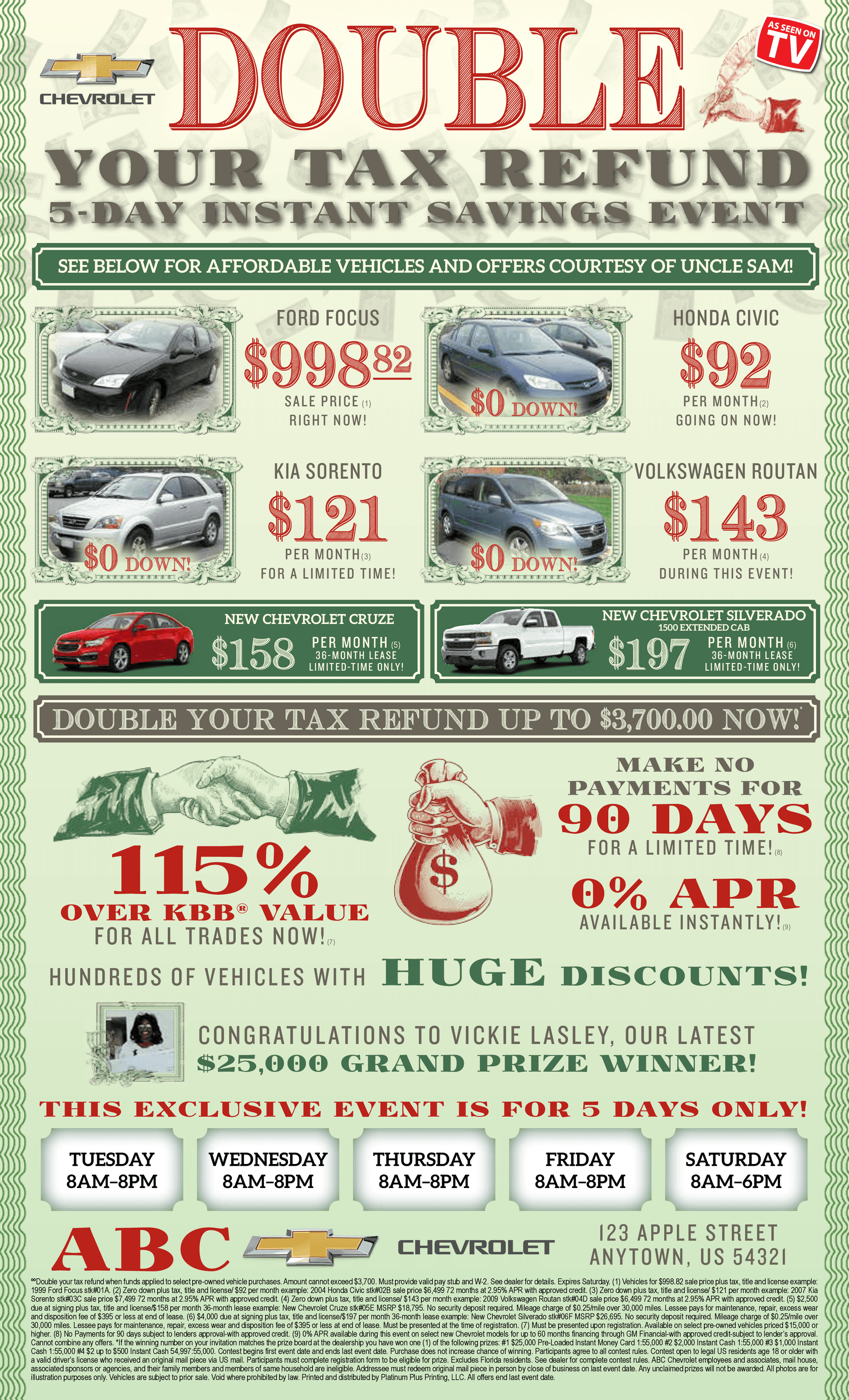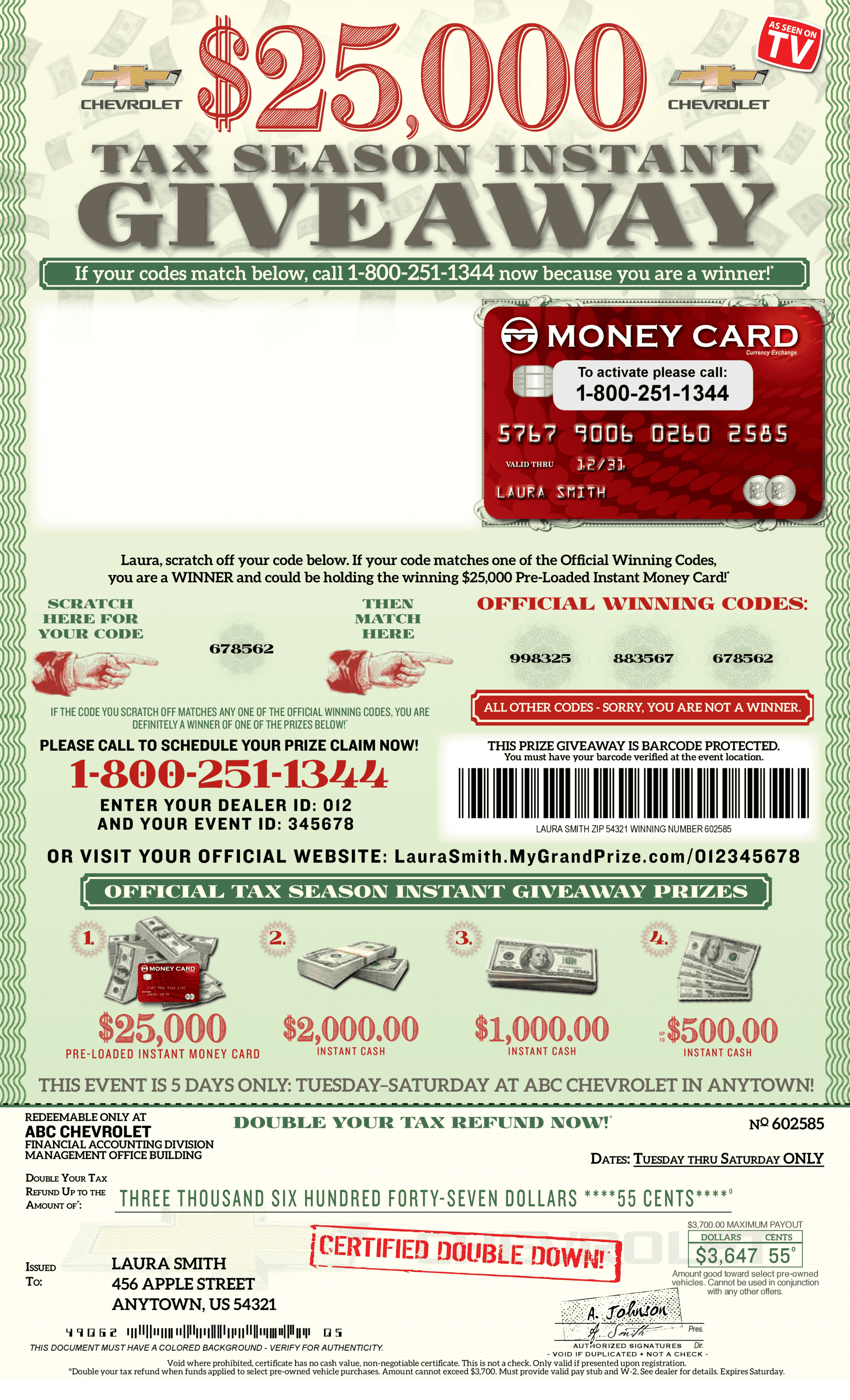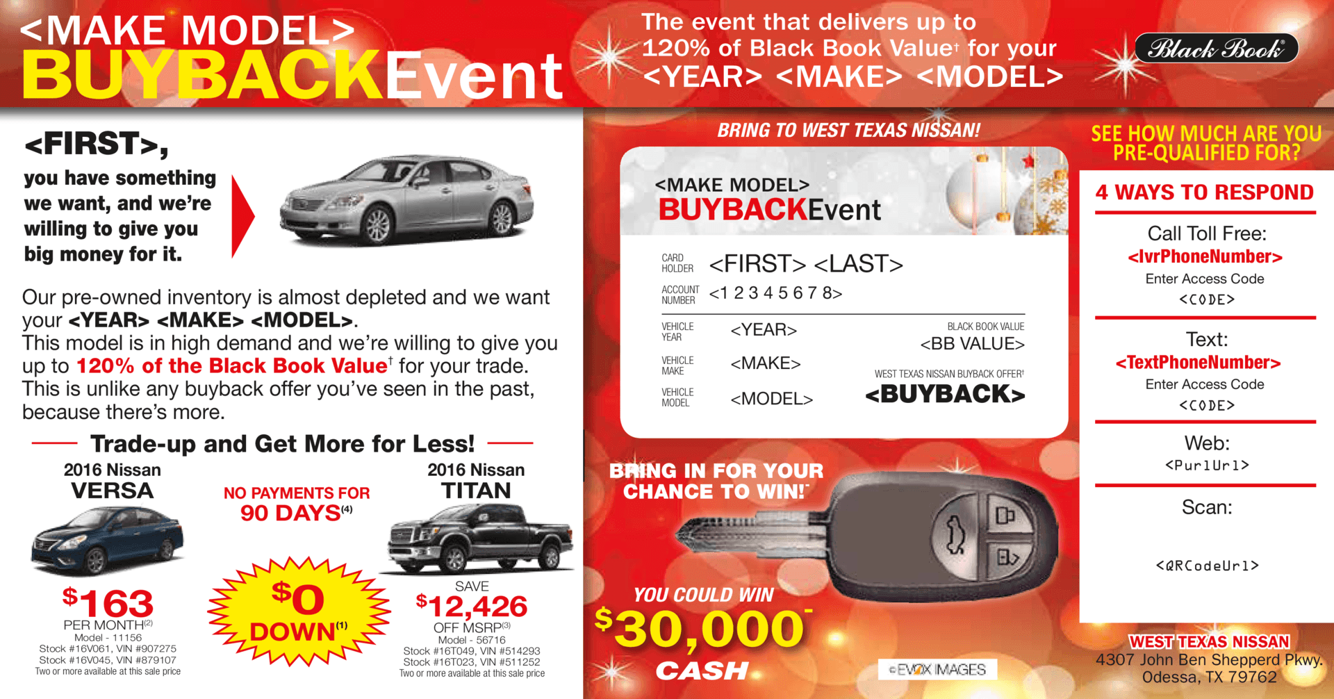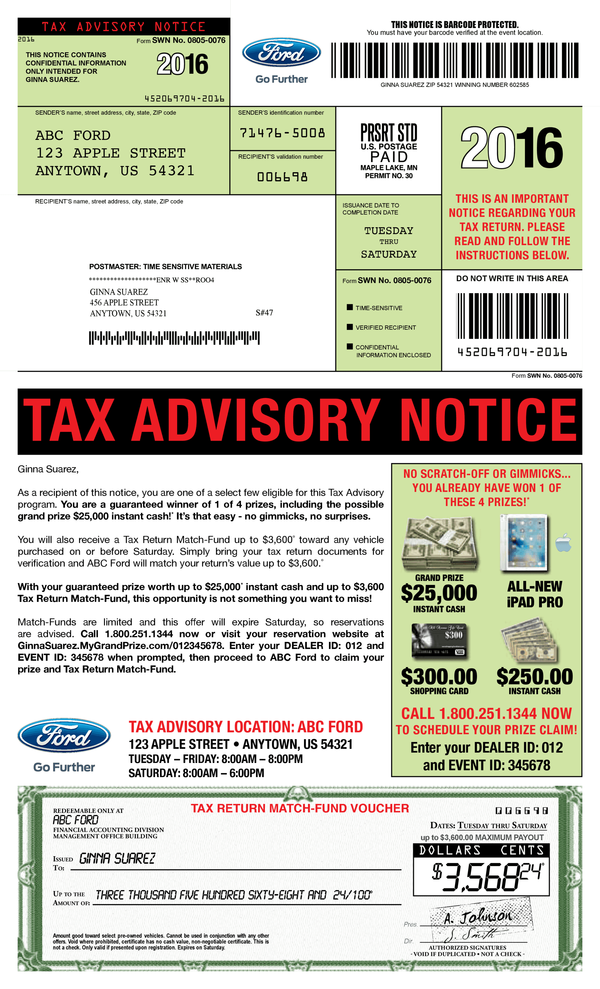 Holiday and seasonal mailing for dealerships is a must. Consumers know that when a holiday arrives, sales go on, and its easy to entice them into your dealership. We can add specialty give-a-ways such as Big Game Tickets, Travel Vouchers, or even a chance to win a new car, with insurance to back it all up. Tax Filing, Valentine's Specials, or Memorial Day and Labor Day Sales Events are all great ideas for sending a seasonal mailer, as well as an opportunity to clear inventory.