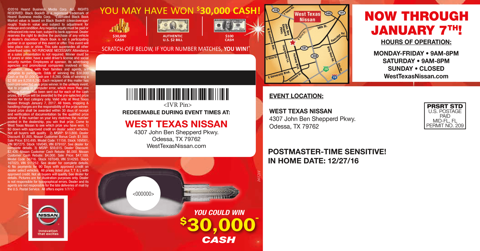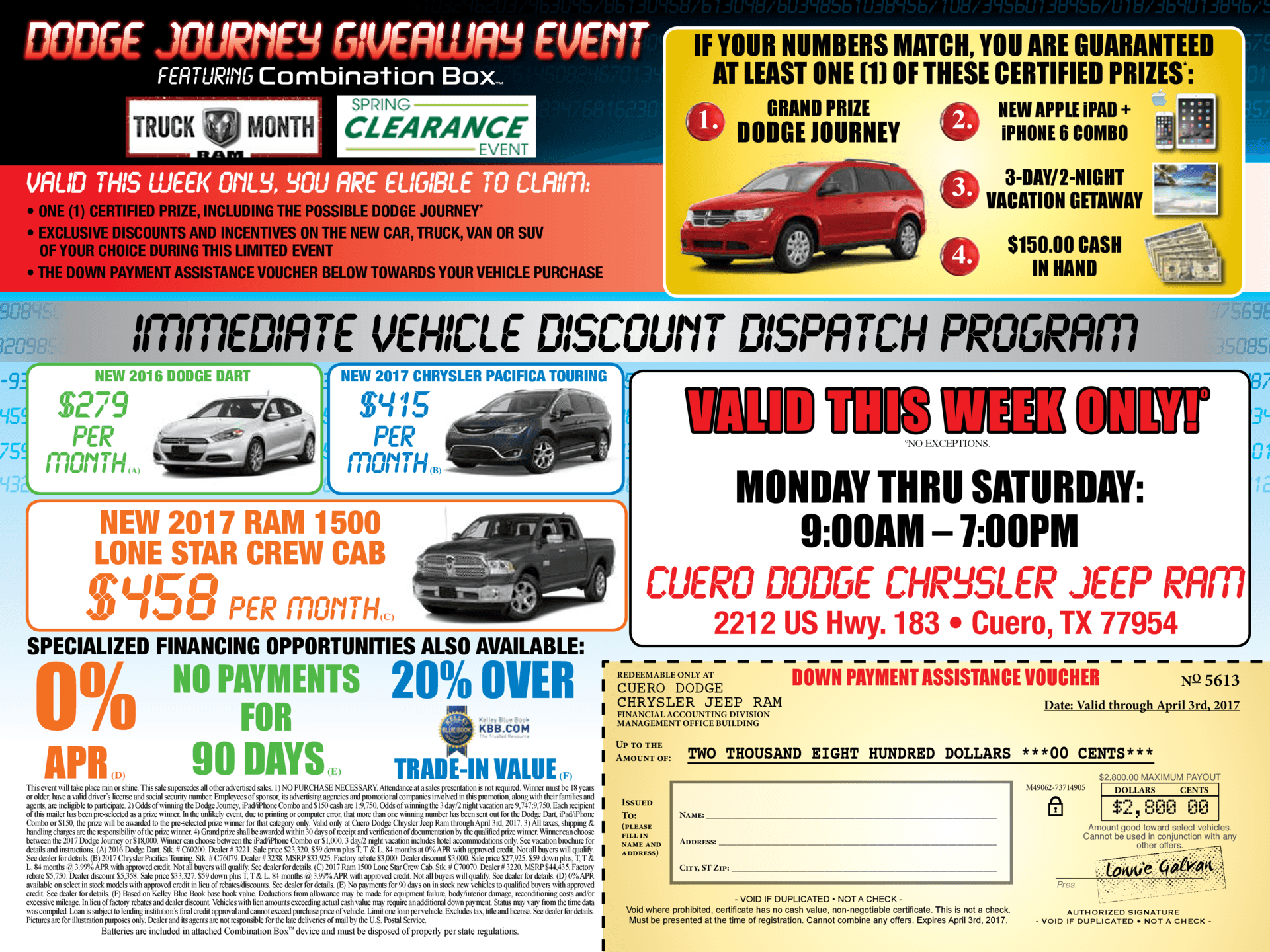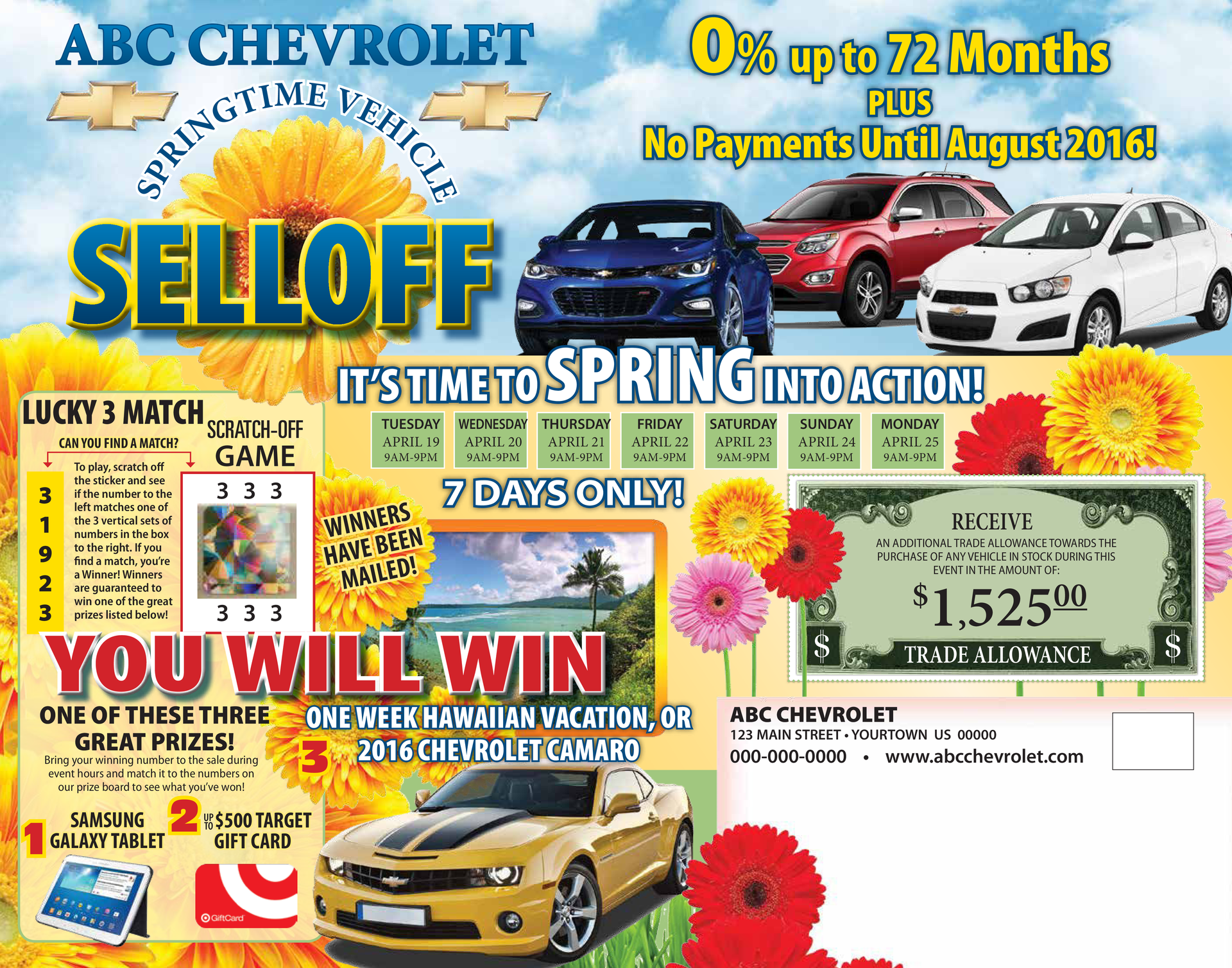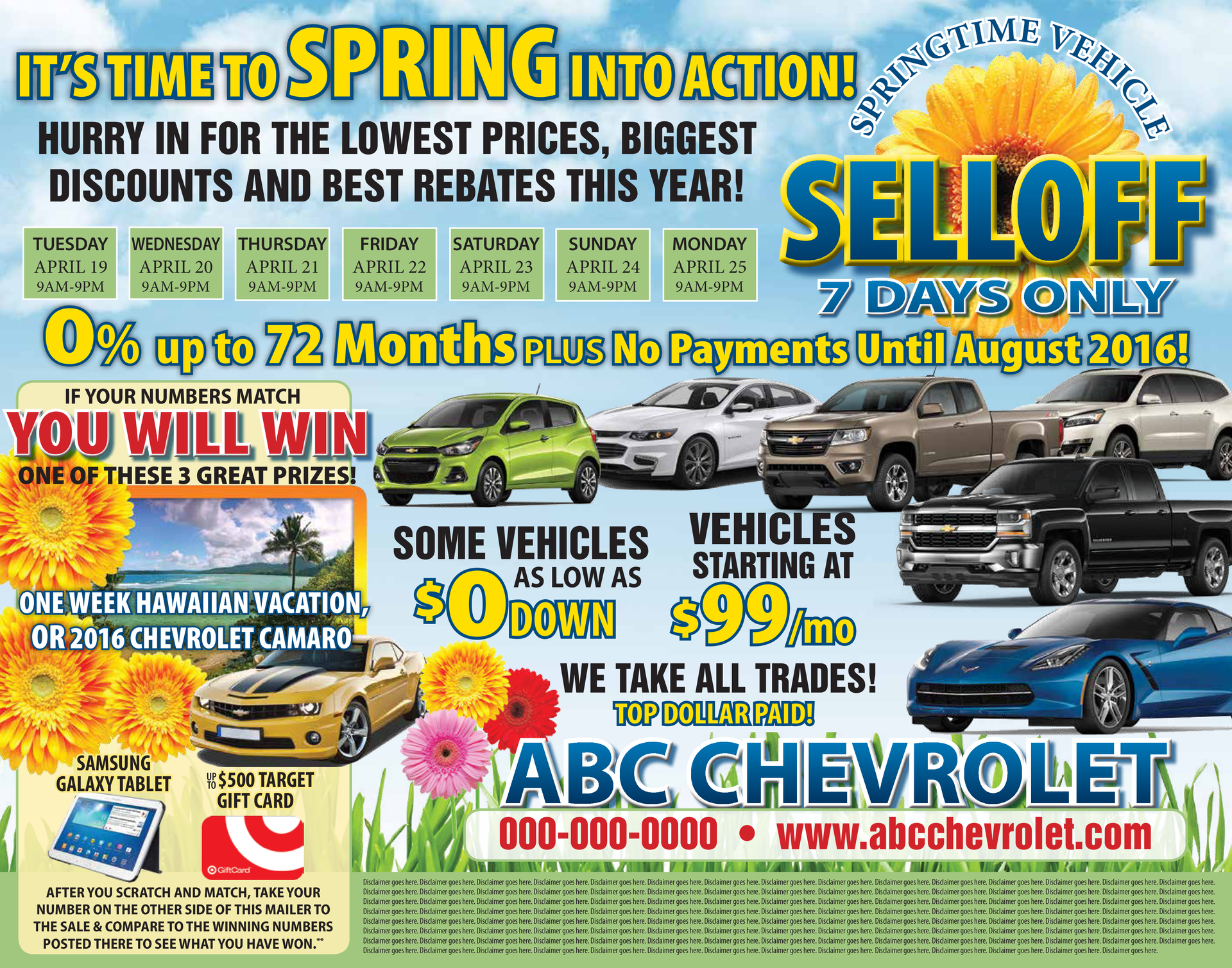 Holiday and seasonal mailing for dealerships is a must. Consumers know that when a holiday arrives, sales go on, and its easy to entice them into your dealership. We can add specialty give-a-ways such as Big Game Tickets, Travel Vouchers, or even a chance to win a new car, with insurance to back it all up. Tax Filing, Valentine's Specials, or Memorial Day and Labor Day Sales Events are all great ideas for sending a seasonal mailer, as well as an opportunity to clear inventory.