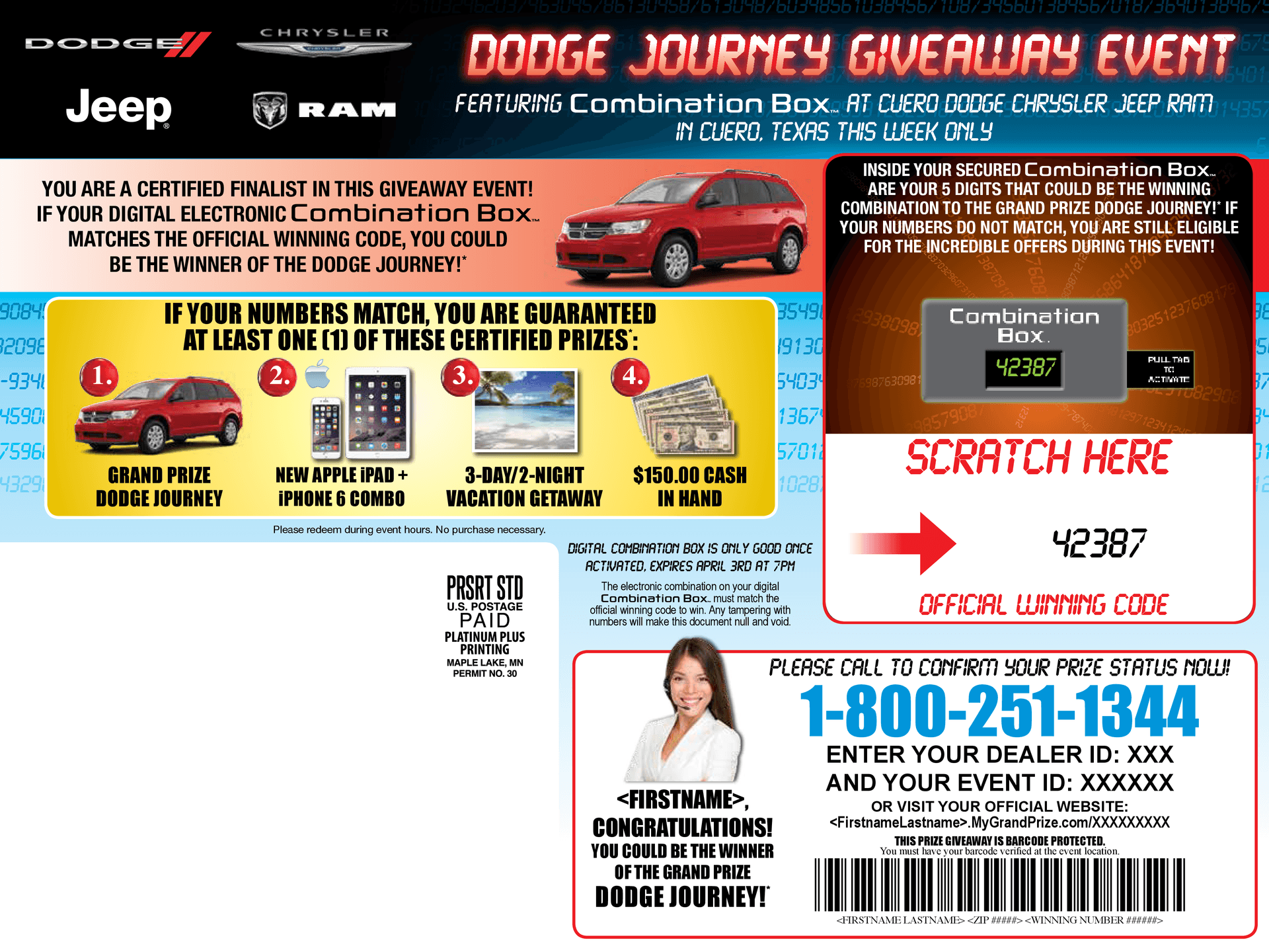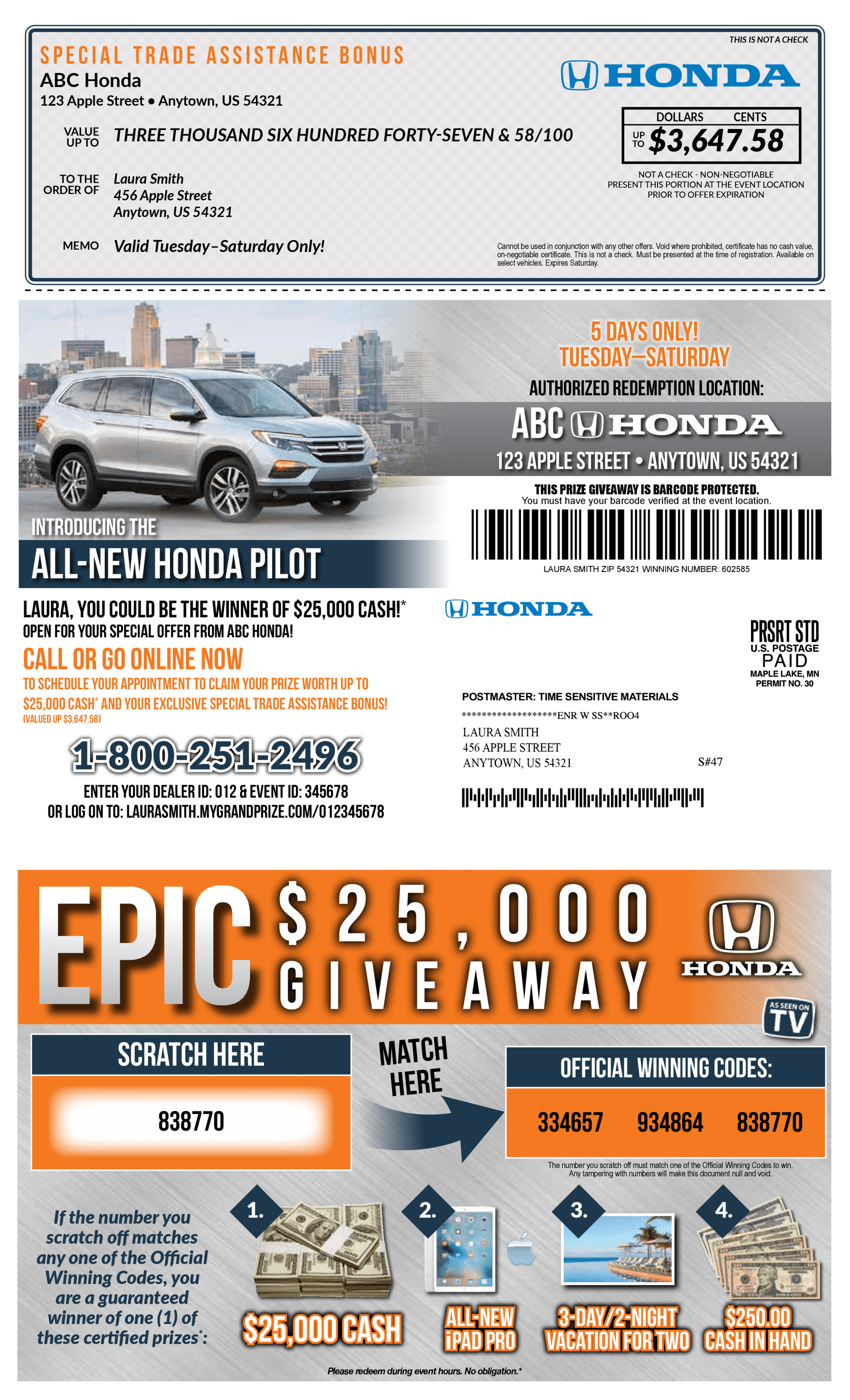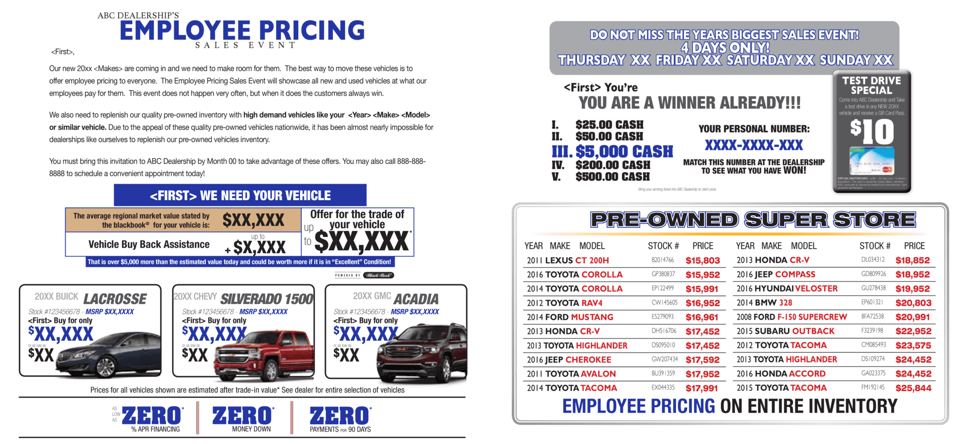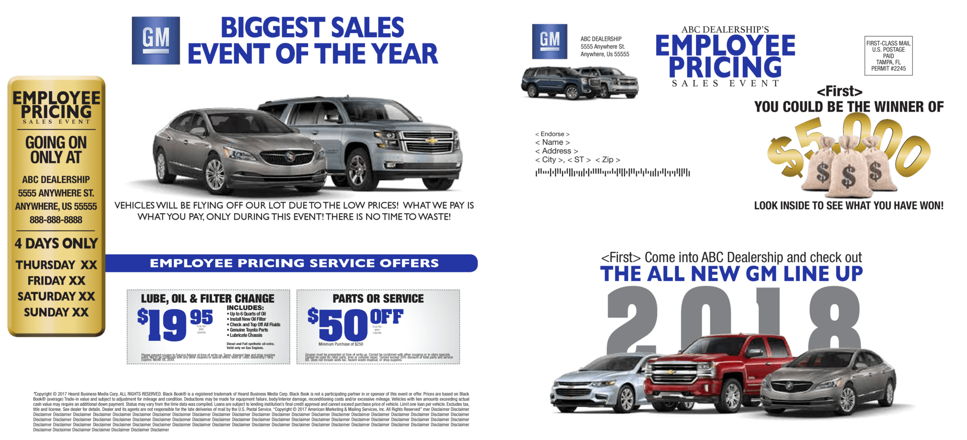 Each piece is personalized with the customer's name and vehicle pictures corresponding to the vehicle the customer drives. For more information about the gift card exchange that comes with most of the variable data mailers.