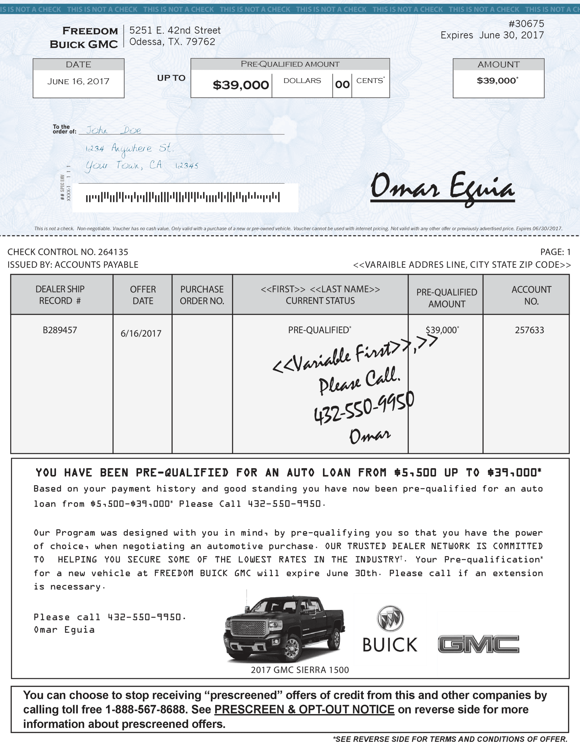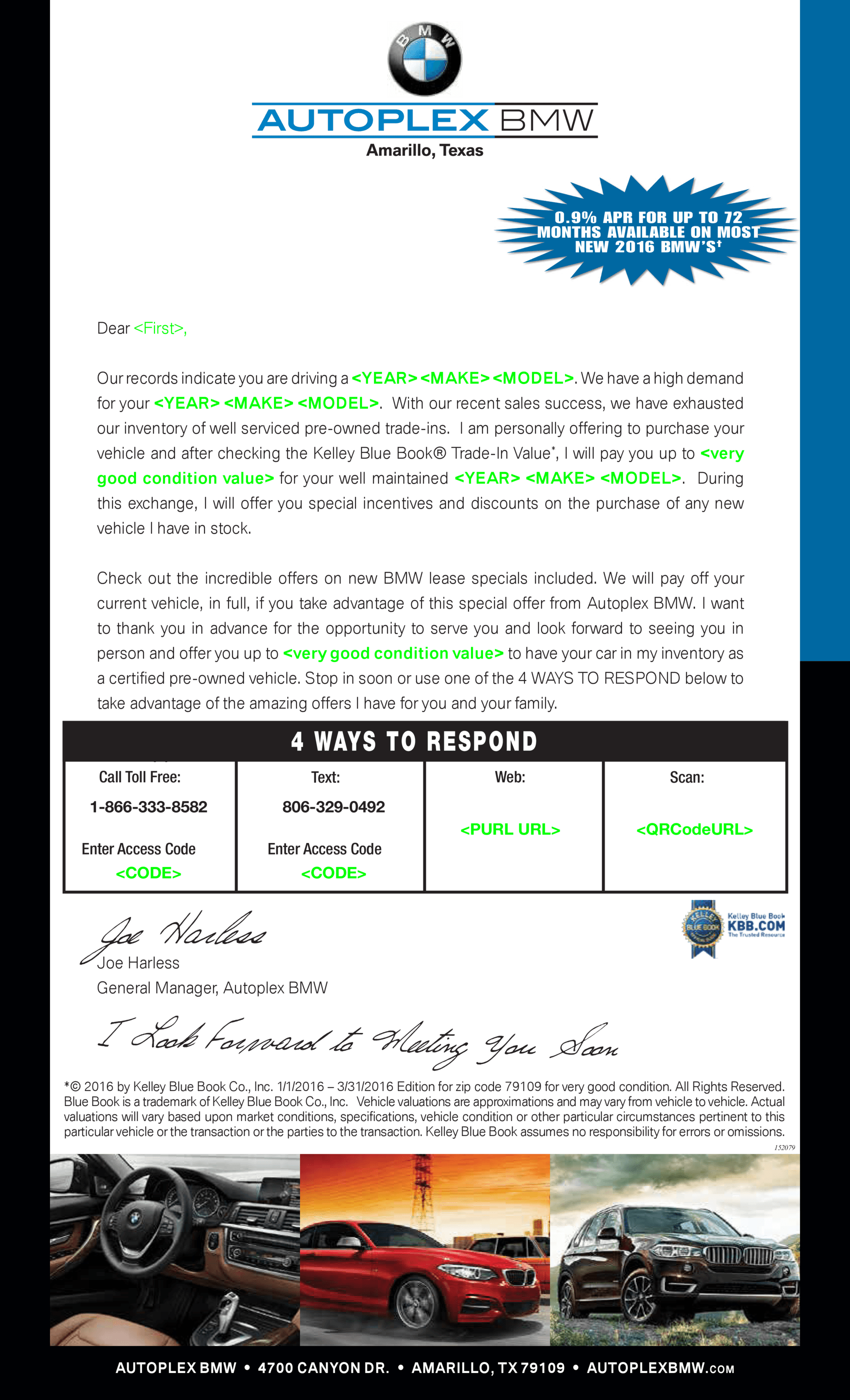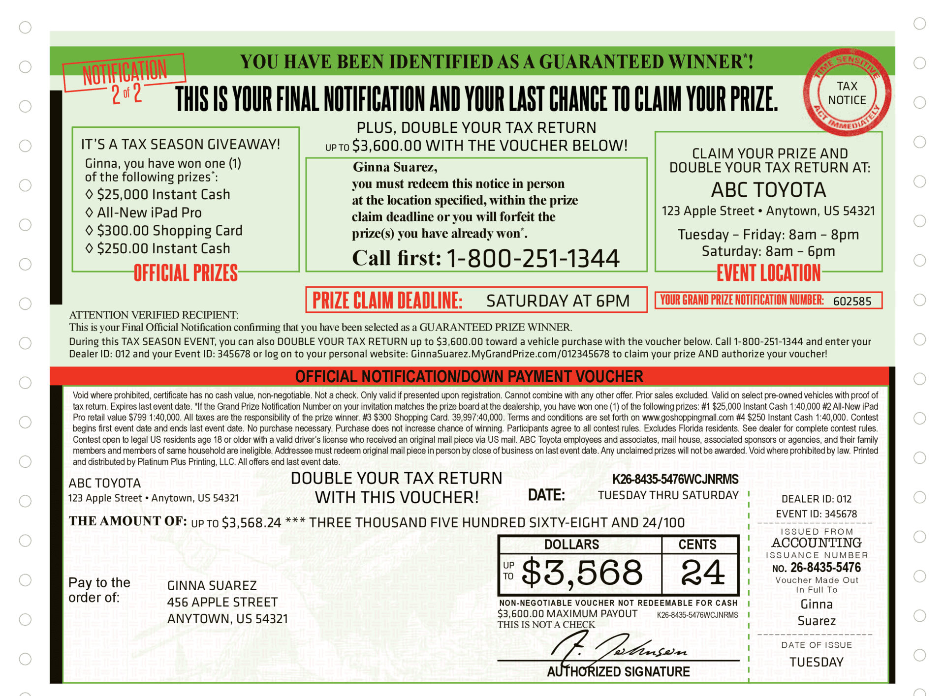 Each piece is personalized with the customer's name and vehicle pictures corresponding to the vehicle the customer drives. For more information about the gift card exchange that comes with most of the variable data mailers.