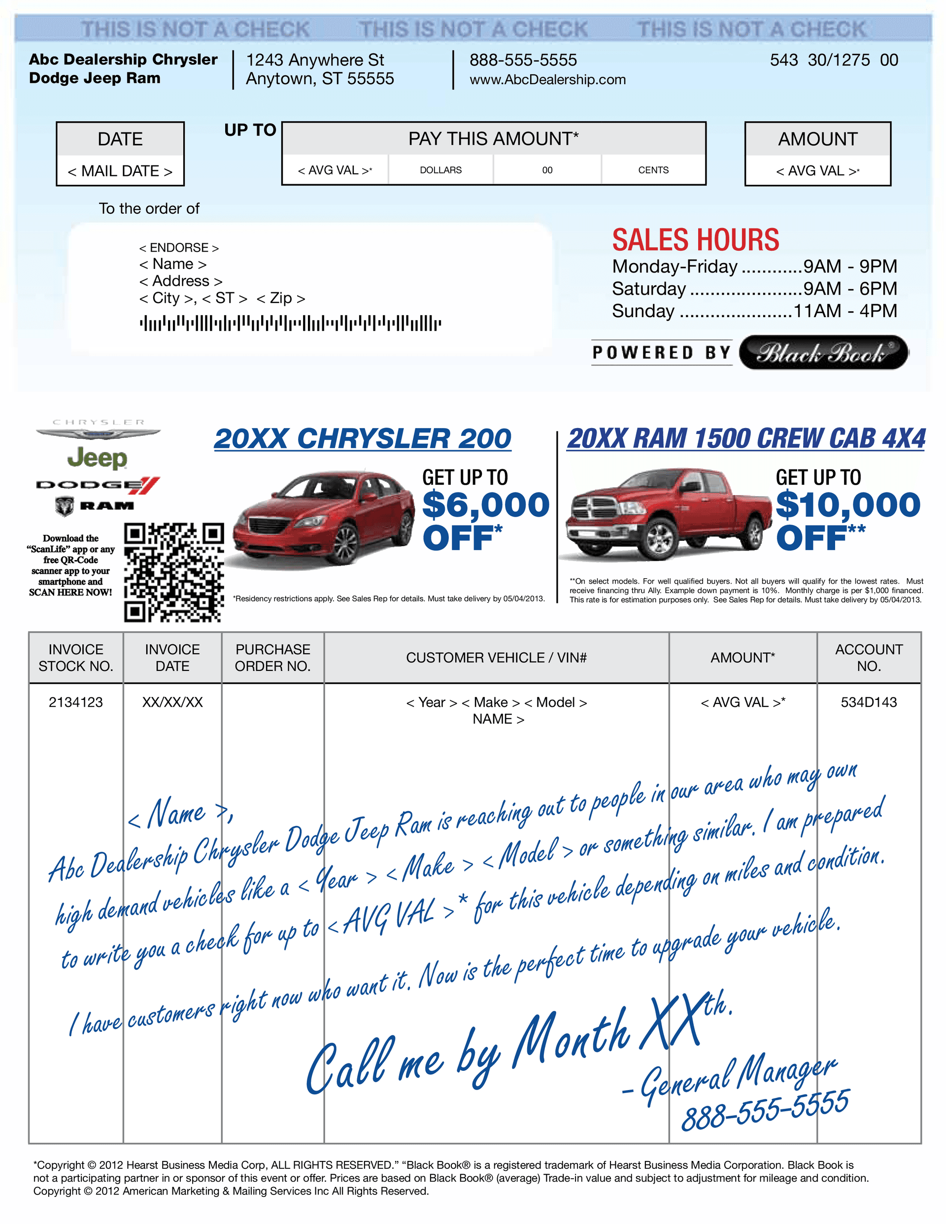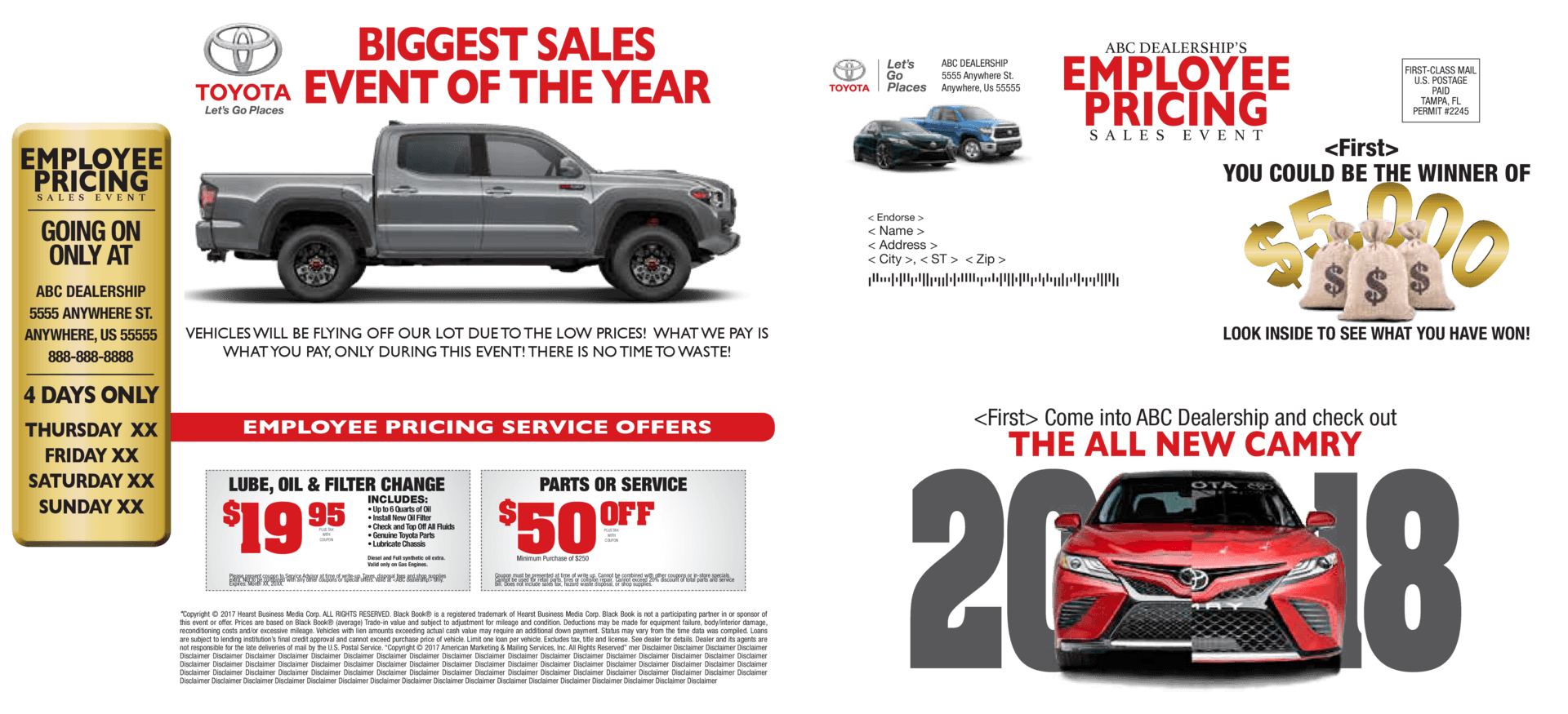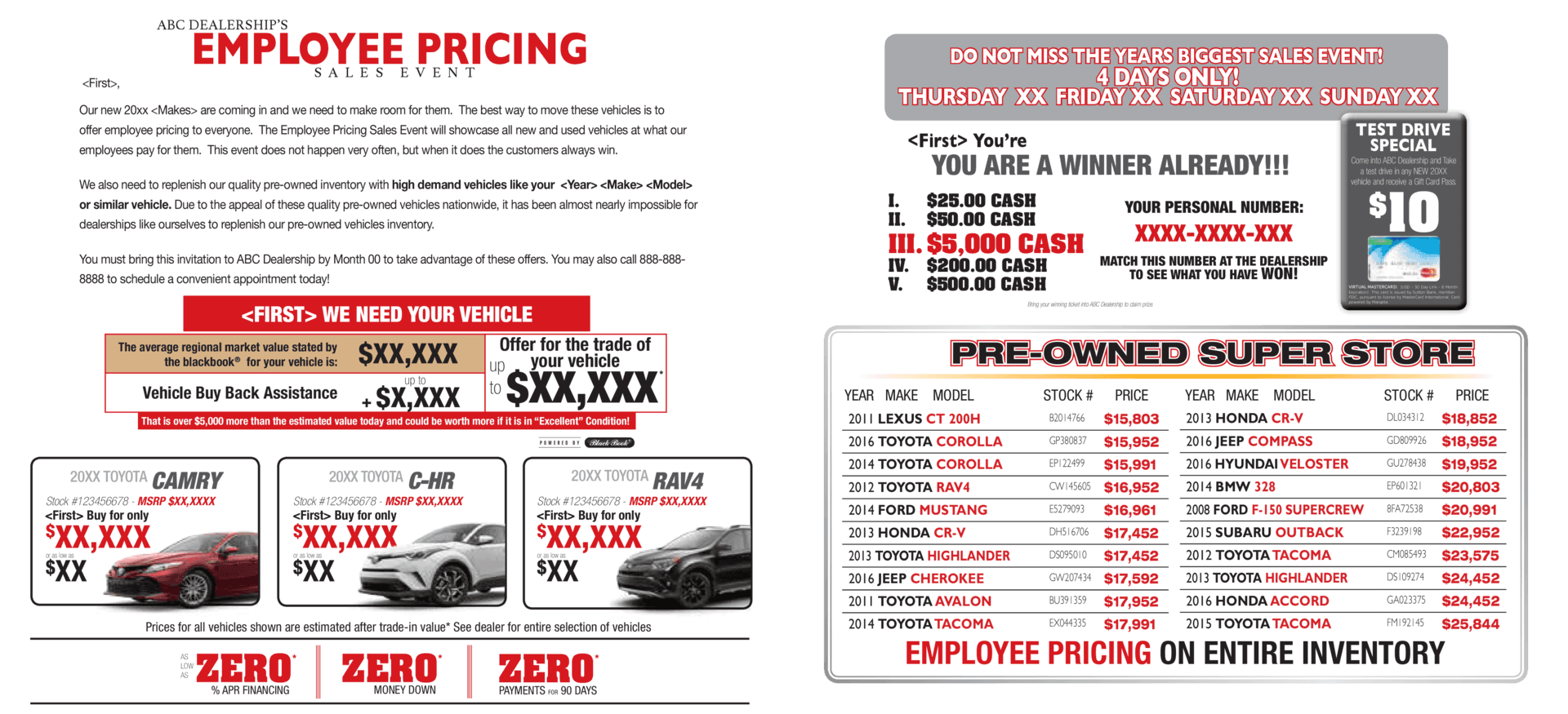 All of these four color pieces can be completely customized. Specific dealership event themes, Red Tag sales and holiday sales are popular themes. However, ACC's graphics team will create a custom mail piece that meets your needs. If you would like to see live samples, just REQUEST a SAMPLE PACKET.